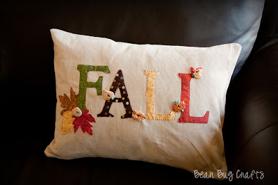 Today I'm going to share with you a quick & easy Fall pillow I made. I appliqued the "Fall" letters onto the front of envelope style pillow cover that I made from an old curtain that we had.
